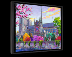 Our landmarks are a part of our landscape and history, and I always admired the masterful, incredible details on Notre-Dame. It was sad to see it burn in flames five years ago, and that's when I decided to create this painting. As artists we possess powerful tools that can revive and preserve lost visions. Through this framed art print on canvas of Notre-Dame de Paris, I wanted to rebuild its majestic beauty surrounded by the vibrant colors of spring, for everyone to enjoy.