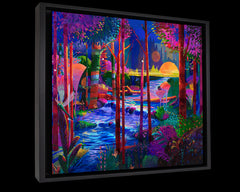 The forest is quiet. The leaves have stopped arguing with the wind, the bushes below have lowered their heads to get some rest and the flowers have already said goodbye to the sun. The river keeps singing endlessly, running away from the sinking moon that is tired of holding herself up. In this framed art print on canvas, only the giant trunks are still awake and watching, standing tall and guarding the forest as it falls asleep. But not for long, their strength keeps them up but the night is long and the dreams are sweet... and they're asleep.